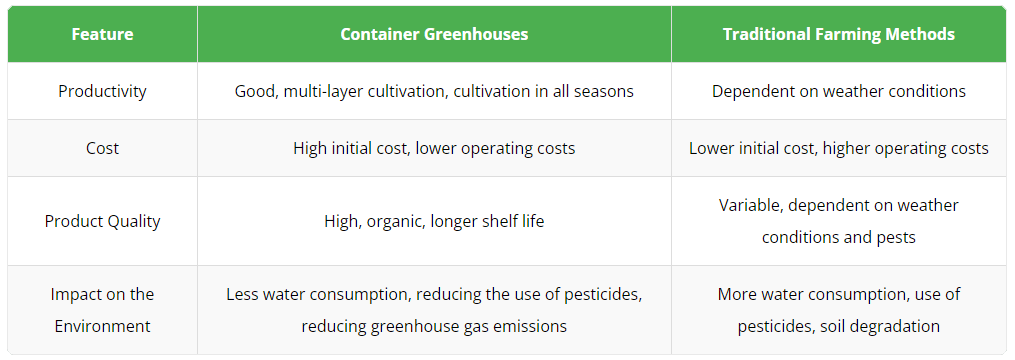 Container greenhouses increase the process of food production and are more productive compared to traditional farming.